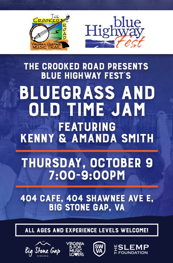 #BlueHighwayFest #CrookedRoadJam #BigStoneGapEvents #KennyAndAmandaSmith #BluegrassJam #OldTimeMusic #LiveMusicSWVA #VirginiaMusicTrail #SWVAEvents #VisitBigStoneGap #MusicLoversUnite #MountainMusicMagic