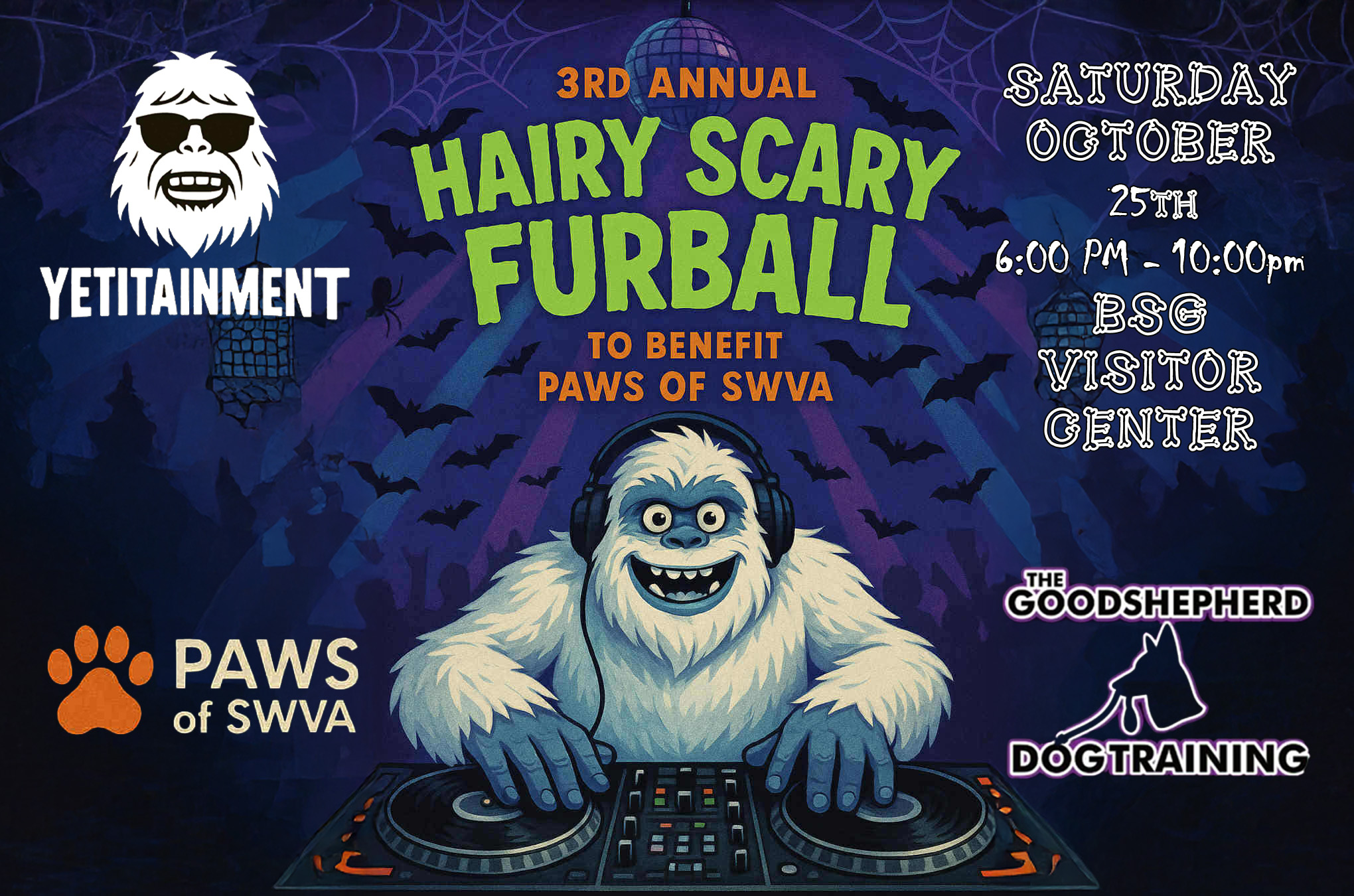 Come party with us at the 3rd Annual Hairy Scary Fur Ball ๐ป๐พ on Saturday, October 25th (6โ10pm) at the Big Stone Gap Visitor Center. All proceeds go to help Paws of Southwest Virginia โ so every beat dropped helps a furry friend!