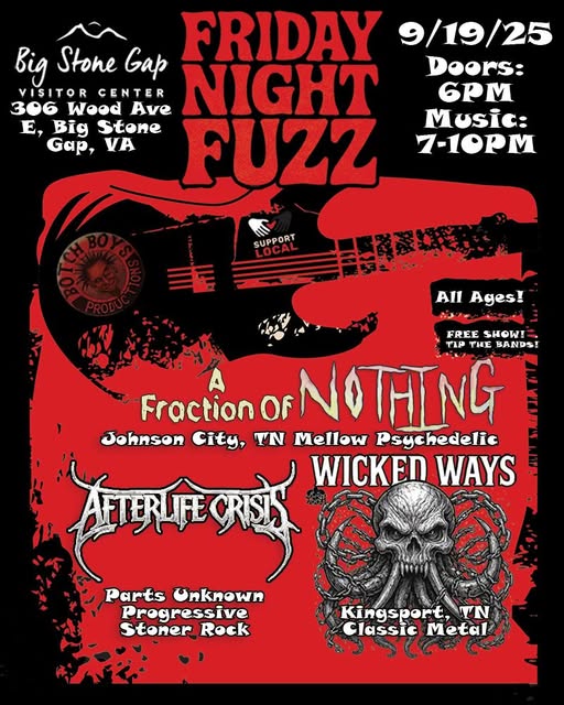 Friday 9/19/25 It’s time to get heavy and trippy with another Friday Night Fuzz! We’ve got 3 killer acts to get your juices flowing and vibes rolling! One representing Virginia, one from Tennessee, and the other from Parts Unknown, wherever that is!