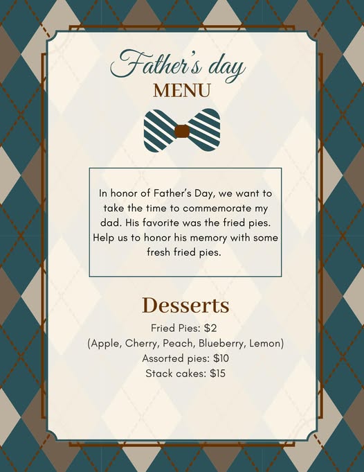 To all of the fathers, thank you for all that you do. We wanted to take the time to honor my dad with this menu. His favorite sweet was the fried pies
