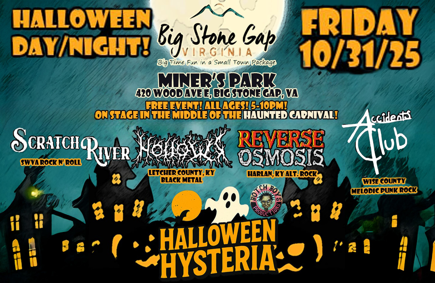 Friday 10/31/25 Botch Boys Productions has the privilege of celebrating Halloween at Miner’s Park in Big Stone Gap, VA! We’ll be providing 4 amazing bands, on stage right in the middle of the Haunted Carnival! Bring just yourself, or the whole family, and celebrate with us!