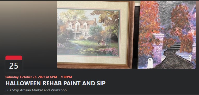 Join us for the first Paint and Sip event @ Bus Stop Artisan Market and Workshop. You will spend an evening transforming a thrifted picture by making a Fall/ Halloween makeover while enjoying complimentary local Wine and treats.