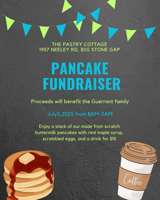 We had planned to be closed this Saturday for the holiday weekend, but we have decided on something different. Many of you know Donna and Steve Guerrant. Donna owns Guerrants Goodies in Big Stone Gap, and right now, Steve is facing some health issues. Donna is at the hospital with him and has not been able to open her shop these past 2 weeks because of it. We know firsthand how difficult it can be to manage a business when a family member is not well, so we want to help them out until they can get back to business. We will be hosting a pancake breakfast at our store this Saturday, July 5th. All proceeds will go to the Guerrant family. We will serve pancakes from 8AM until 11 AM or until we run out. Please come out if you can!