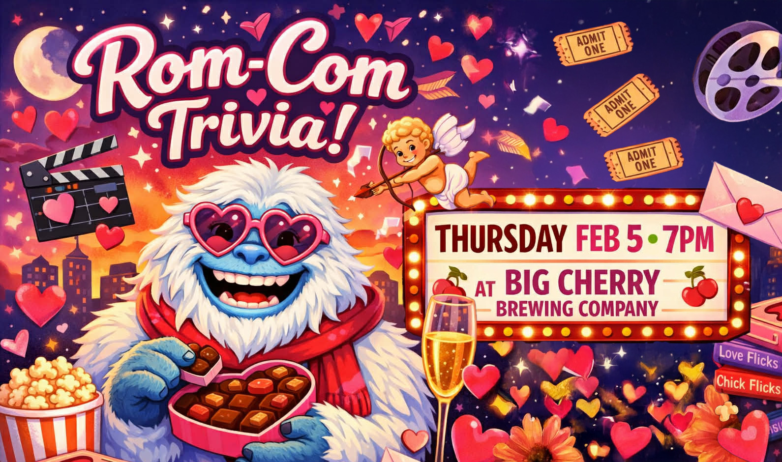 Get ready for a fun and feel good night out as Romantic Comedy Trivia with The Yeti comes to Big Cherry Brewing on February 5th at 7 o’clock.