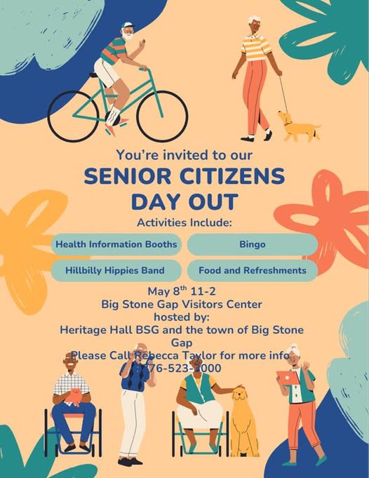Join us for the Senior Citizens Day Out on May 8th from 11 AM to 2 PM at the Big Stone Gap Visitors Center, hosted by Heritage Hall BSG and the Town of Big Stone Gap.