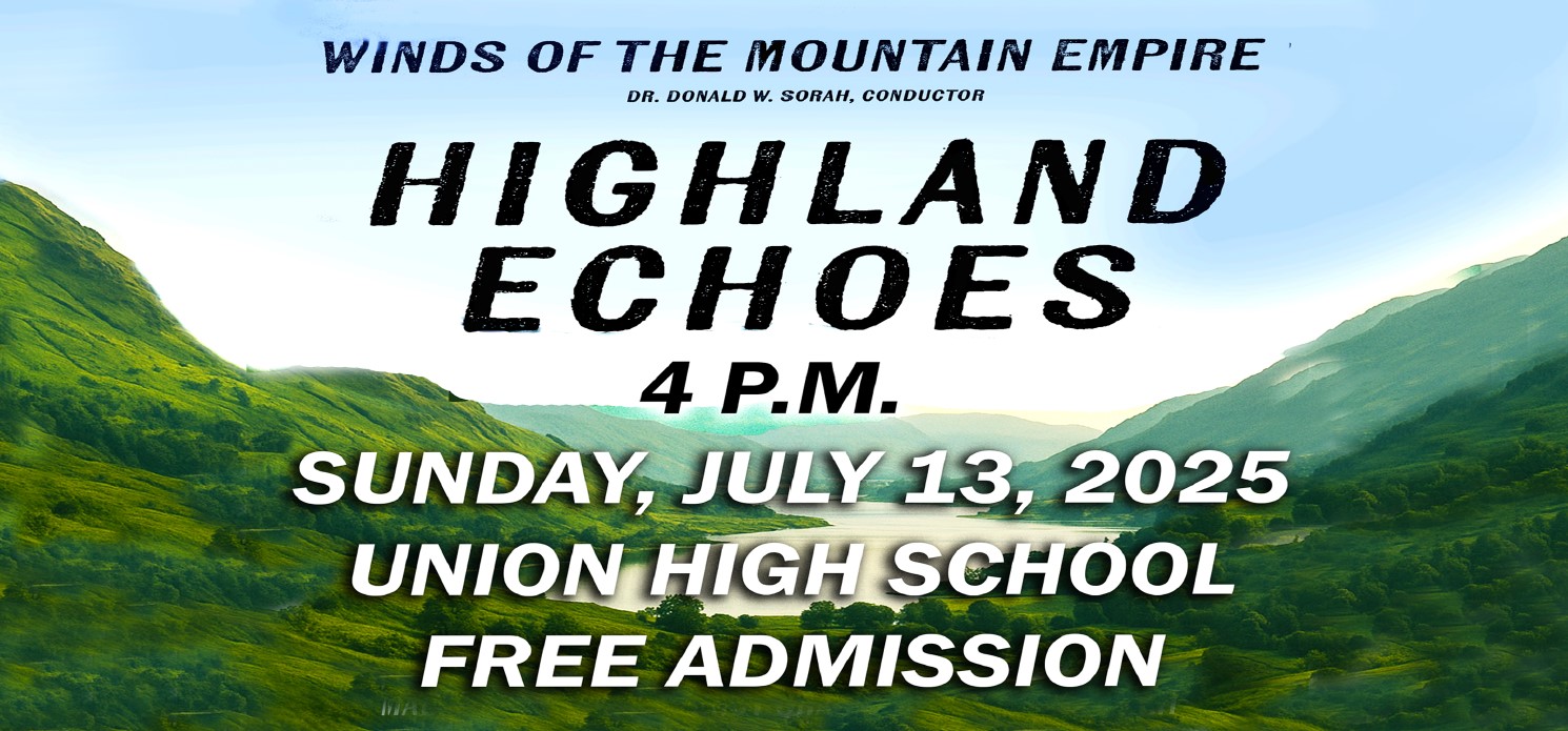The 2025 Winds of the Mountain Empire program is entitled “Highland Echoes.” The concert will feature compositions by Malcolm Arnold (Four Scottish Dances), Percy Grainger (Irish Tune from County Derry and Shepherd’s Hey), Donald Sorah (Radiant Revelry), Ralph Vaughan Williams (English Folk Song Suite), Bill Whelan (Riverdance), and John Williams (Far and Away).