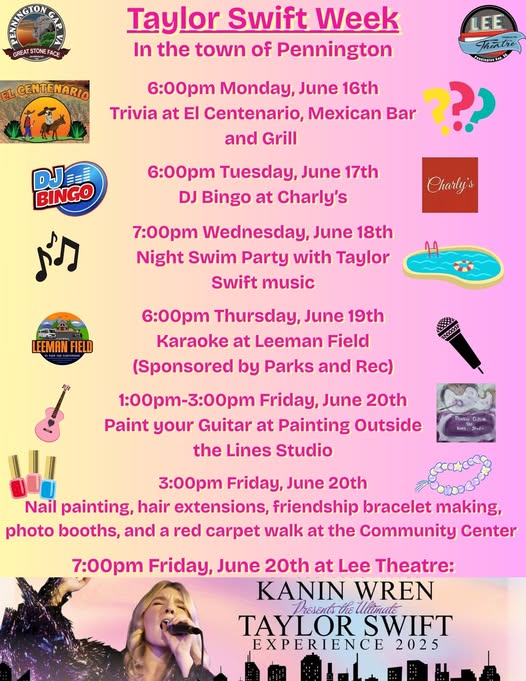 Calling all Swifties! Here is our schedule for our upcoming Taylor Swift Week in the Town of Pennington.