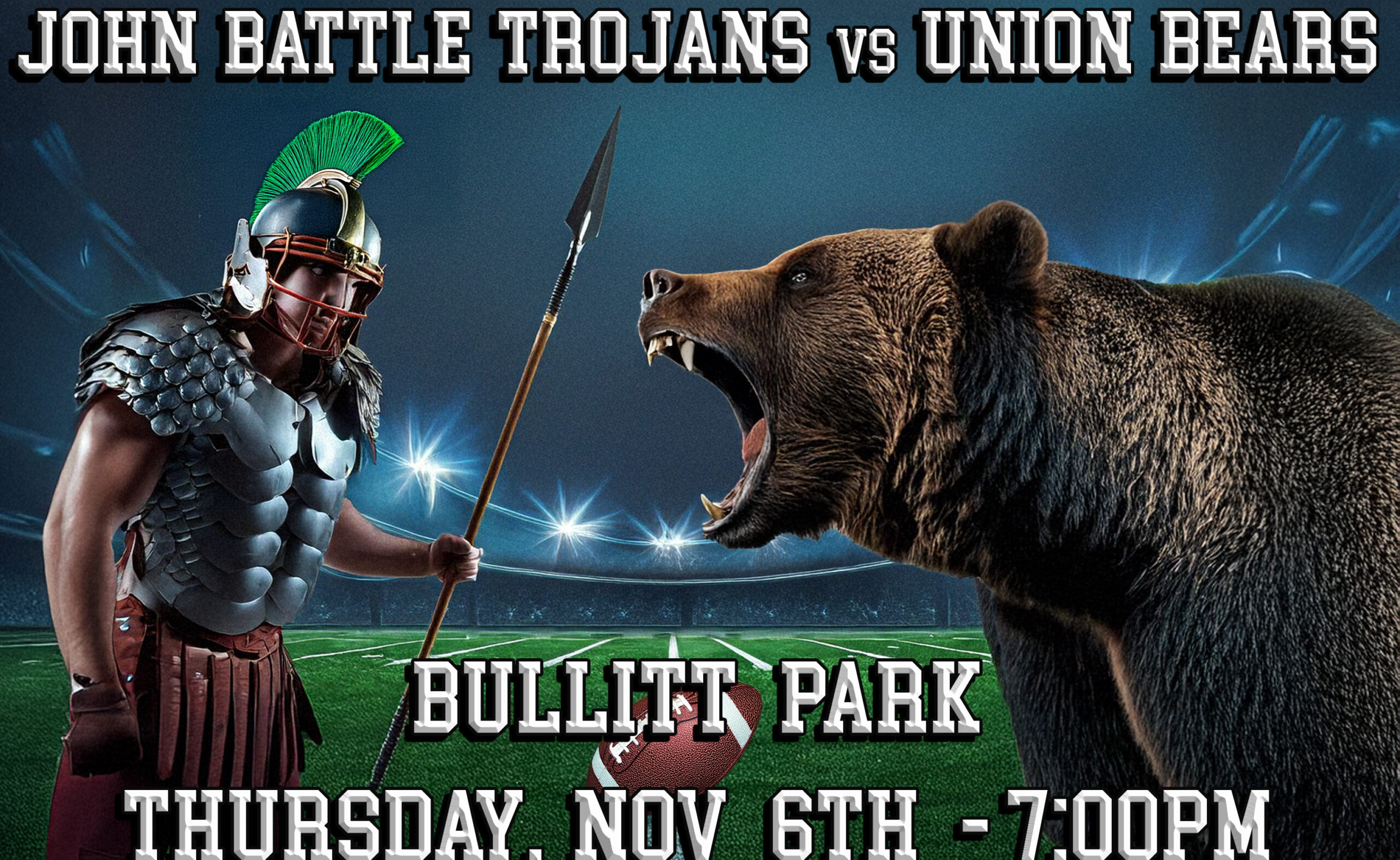 This Thursday night, the John Battle Trojans take on the Union Bears! Don’t miss this epic showdown at Bullitt Park with kickoff at 7 p.m.