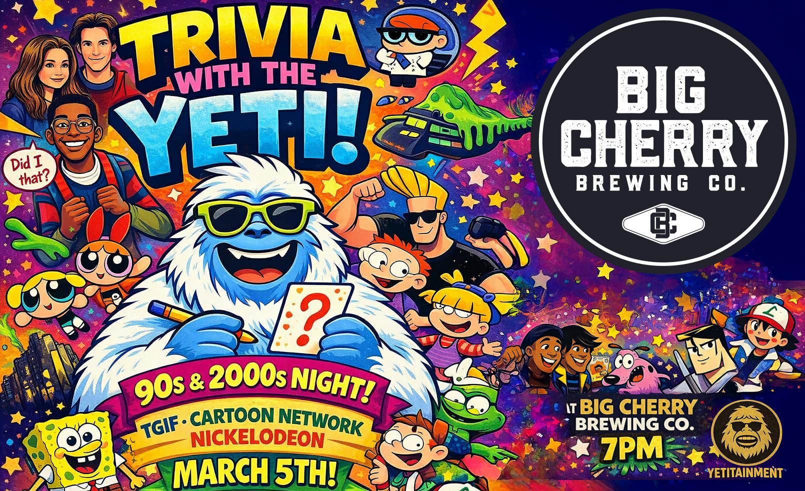 Trivia with the Yeti is coming to Big Cherry Brewing Company and this one is a full blown throwback night. We are talking TGIF, Cartoon Network, Nickelodeon, classic cartoons, sitcoms, and all the pop culture you grew up quoting and still remember way too well.
